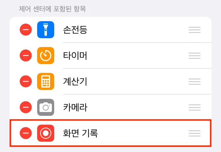 아이폰/아이패드 설정 > 제어 센터에서 화면 기록을 제어 센터에 포함시켜 주세요.