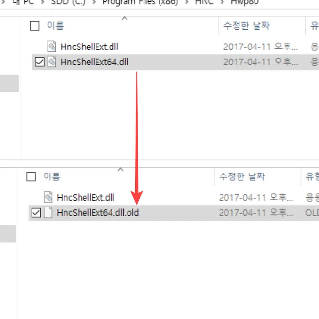 HncShellExt64.dll 이 파일이 자꾸 말썽을 피우는 녀석입니다. 더블 클릭해서 이름 제일 끝에 .old를 붙여주세요. HncShellExt64.dll.old로 되셨나요?