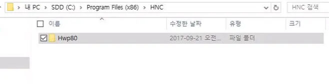 Hwp80 폴더를 클릭해 주세요. 만약, Hwp80폴더가 보이지 않고, HOffice가 보이는 경우, 우측 상단 검색창에 HncShellExt.dll 입력하고, 검색해 주세요.