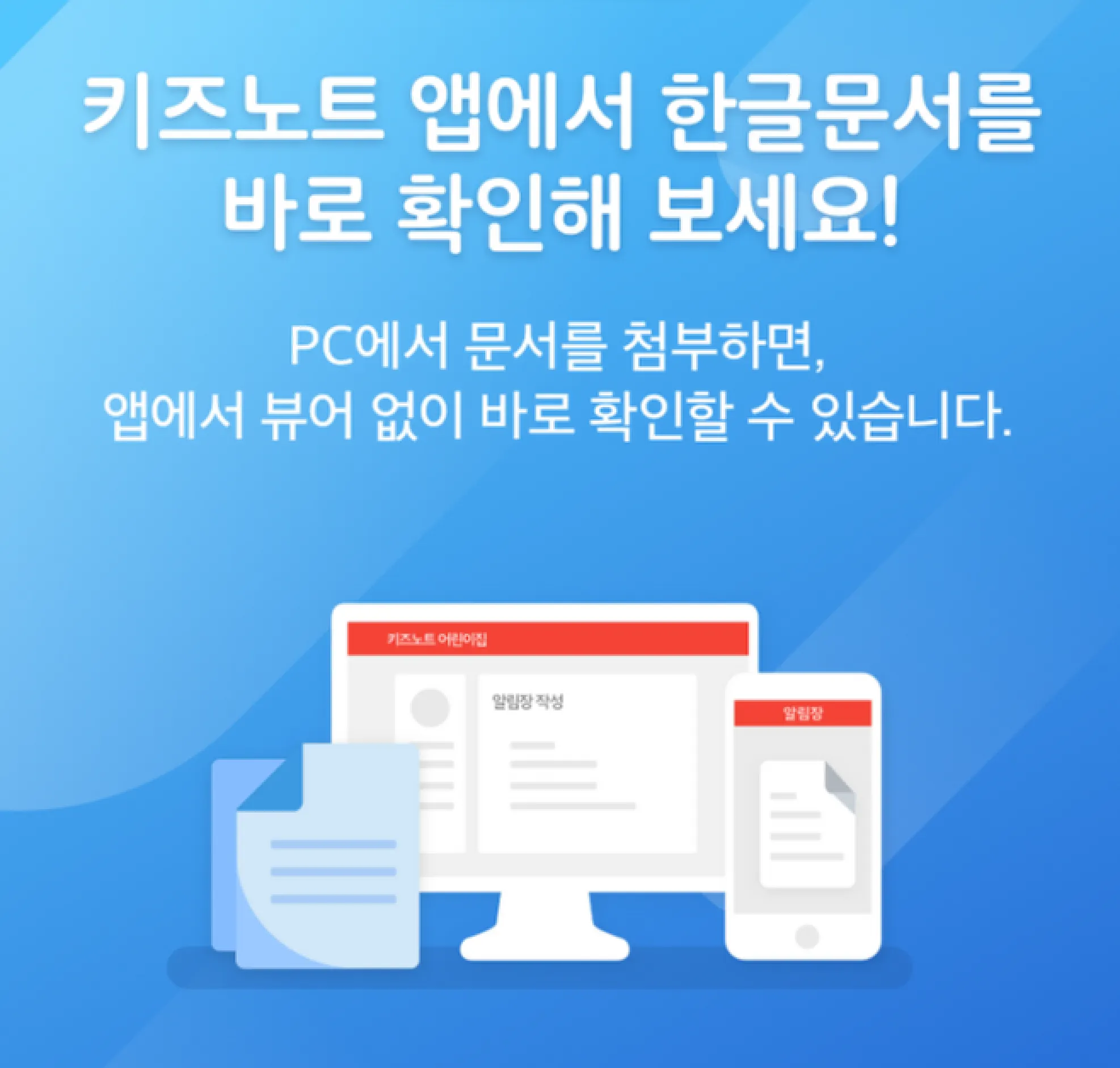 키즈노트 웹에서 문서첨부를 하면문서가 이미지로 변환되어,별도의 뷰어앱 없이바로 키즈노트 앱에서 확인할 수 있습니다.
