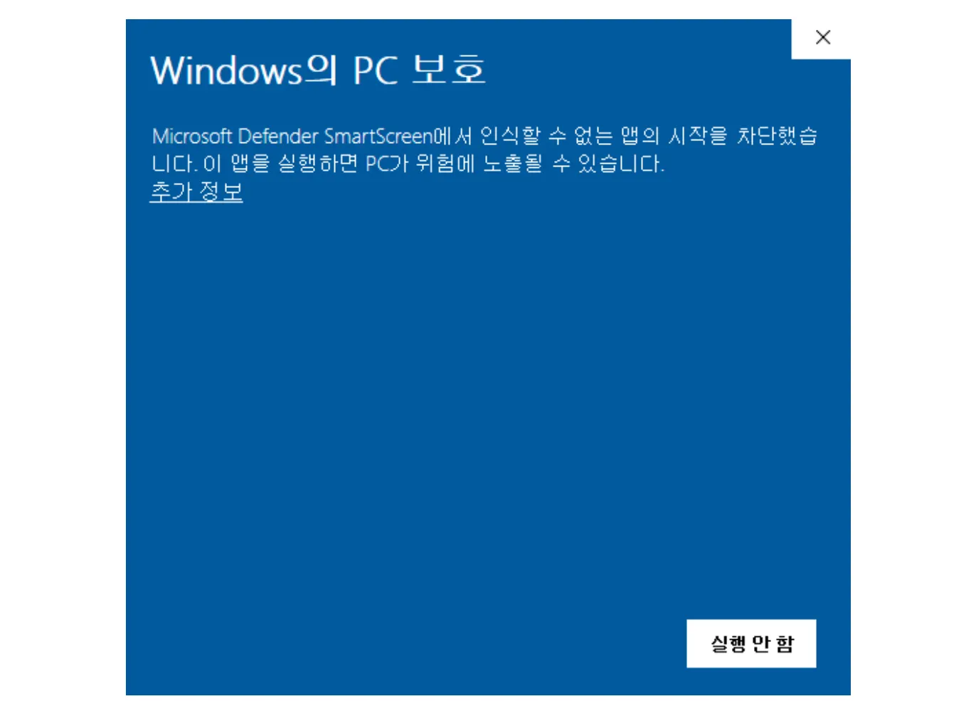 4. windows의 PC 보호 안내창이 보이면 안내창 중간의 추가 정보를 선택, 하단의 실행을 선택합니다.