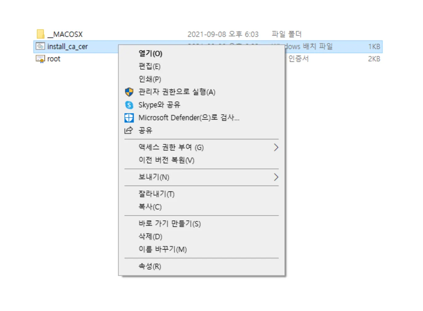 3. "install_ca_cer.bat" 파일 선택 후 마우스 오른쪽 선택 > 관리자 권한으로 실행을 선택합니다.