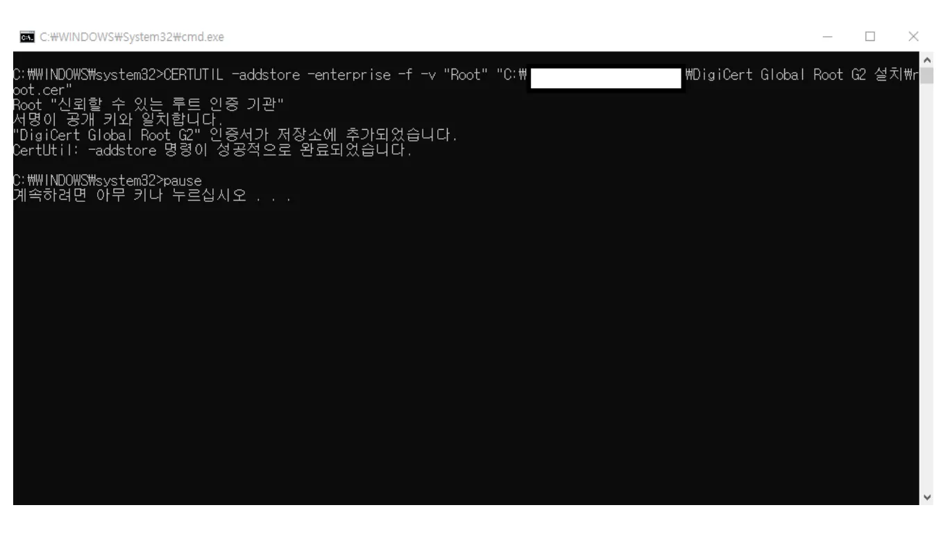 5. 윈도우 명령 처리기에서 "예"를 선택후 노출되는 인증서 추가 안내창을 확인합니다.