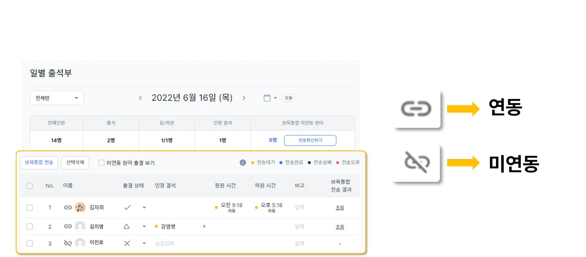 연동된 원아의 출결정보만 전송되니, 꼭 보육통합 연동 여부를 확인해주세요.