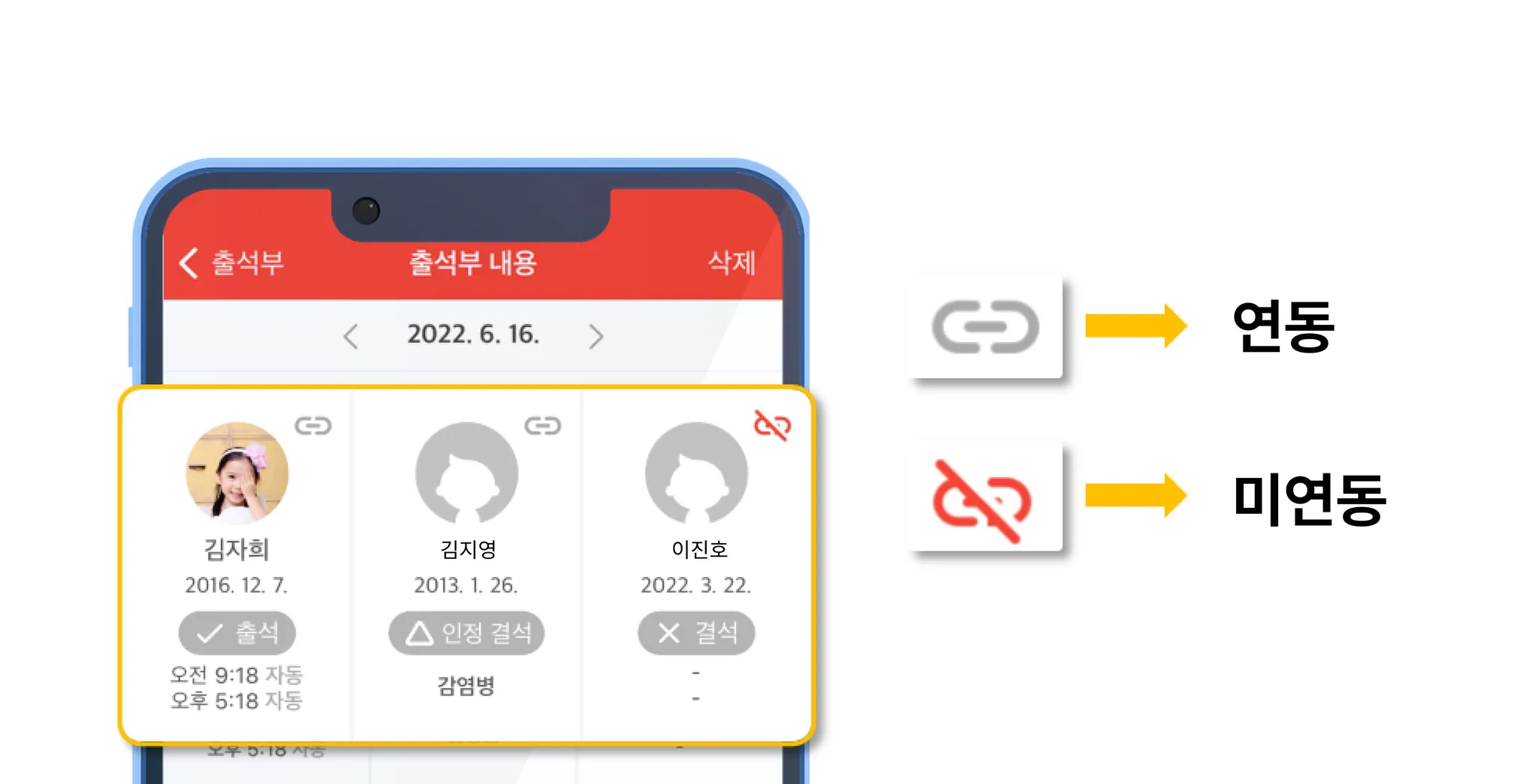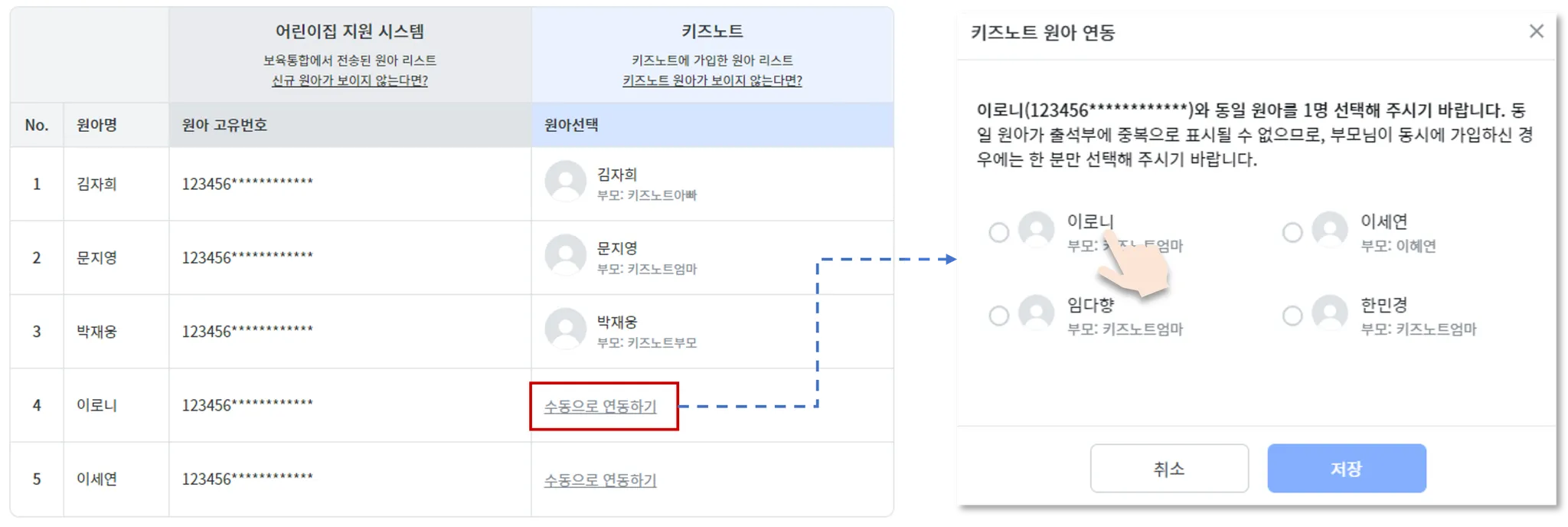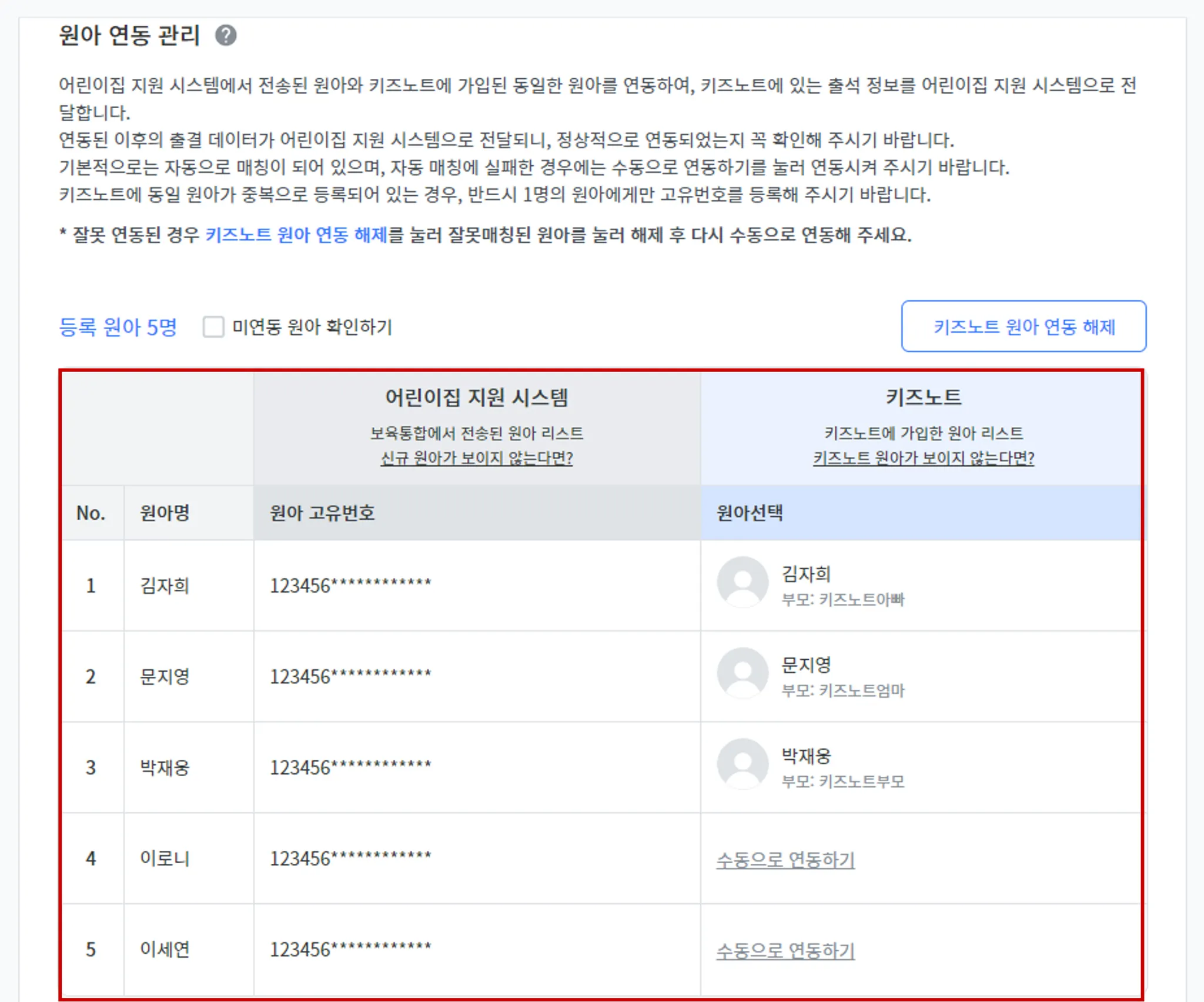 동일한 원아가 중복으로 등록되었다면 한 명의 원아만 매칭됩니다. 미연동된 원아에게 출결 정보가 입력되지 않도록 주의해주세요!