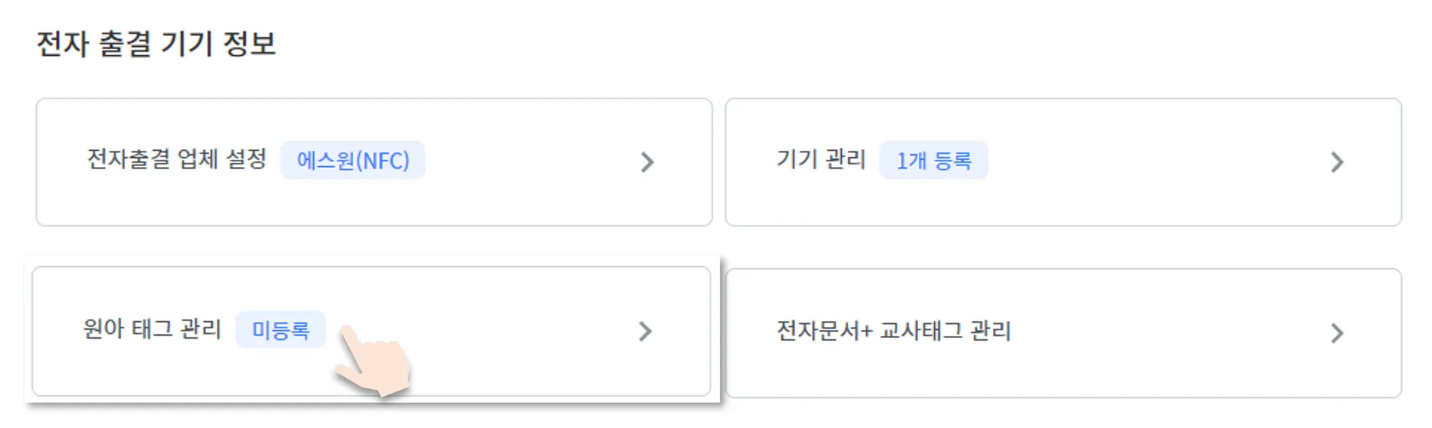 키즈노트 > 원 설정 > 전자출결 설정 > 태그 관리에서 원아의 태그를 등록합니다.