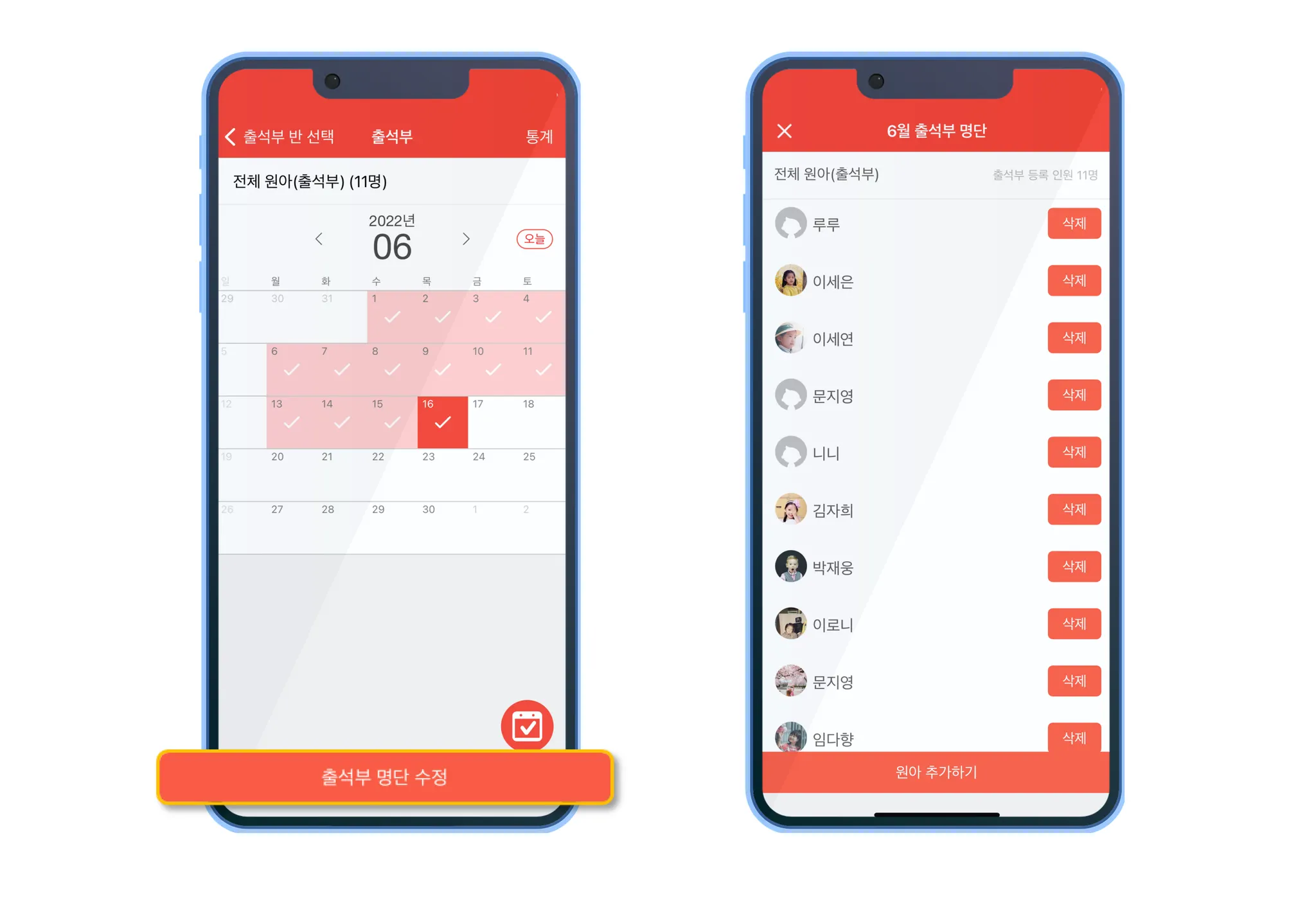 APP 하단, 혹은 PC 월별 출석부에서 출석부 명단 수정 버튼을 눌러주세요.