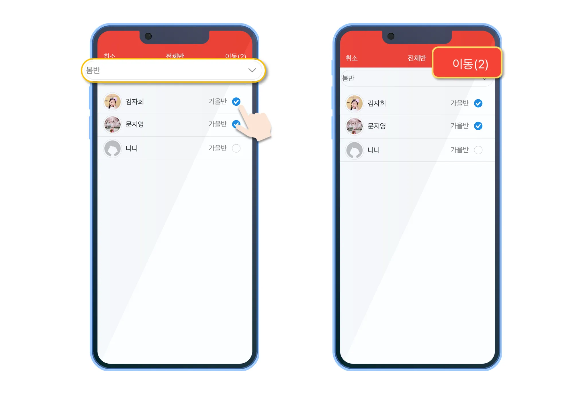 원아가 가을반에서 봄반으로 이동할 때에는 반 이동 시키기를 선택해주세요.