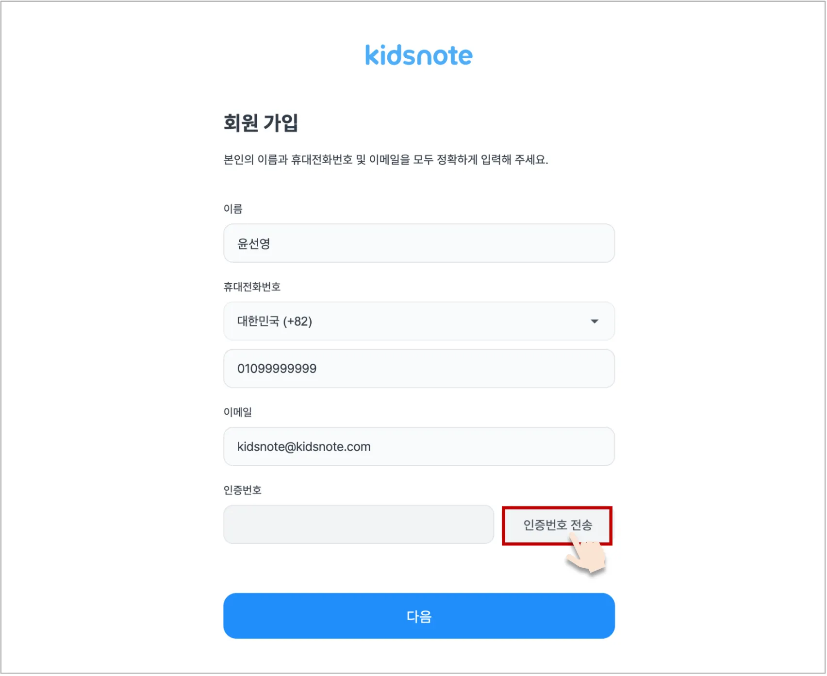 - 재전송 시도에도 인증번호가 오지 않을 경우 키즈노트 고객센터(1644-6734 / 카카오톡: @키즈노트)로 문의 주시기 바랍니다.