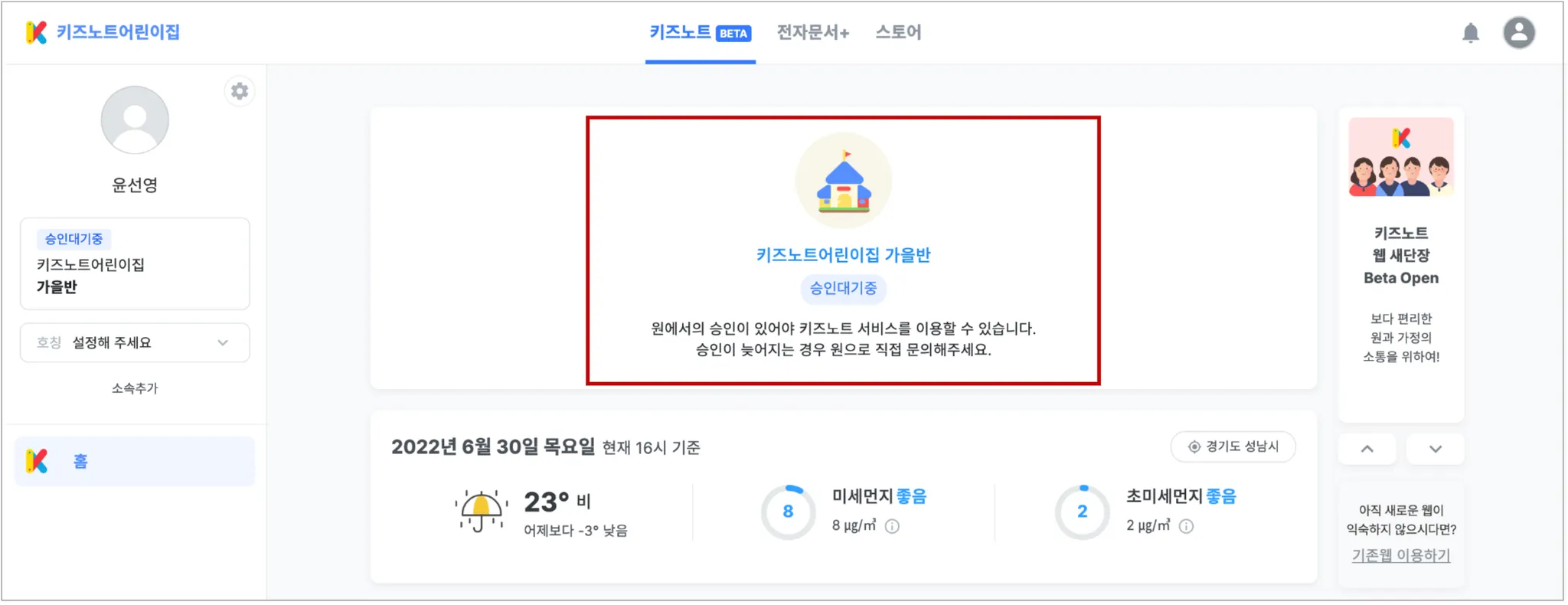 초대로 가입하지 않았기 때문에 승인대기중 표시와 함께 아직 키즈노트 사용이 되지 않습니다. 원에서 승인을 기다려주세요.
