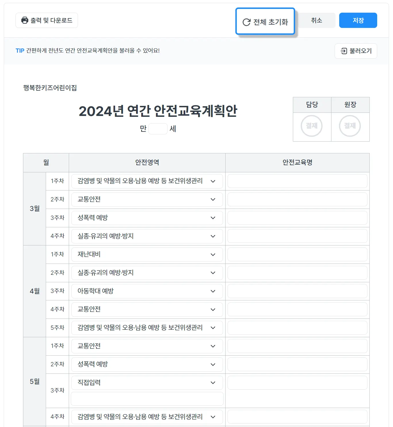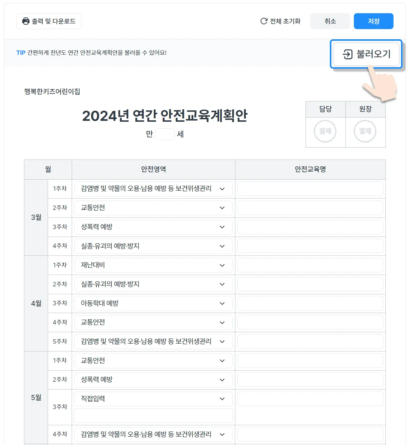 전년도 연간 안전교육계획안을 작성하셨다면, 불러오기 를 통해 올해 안전교육계획안을 간편하게 작성할 수 있어요!