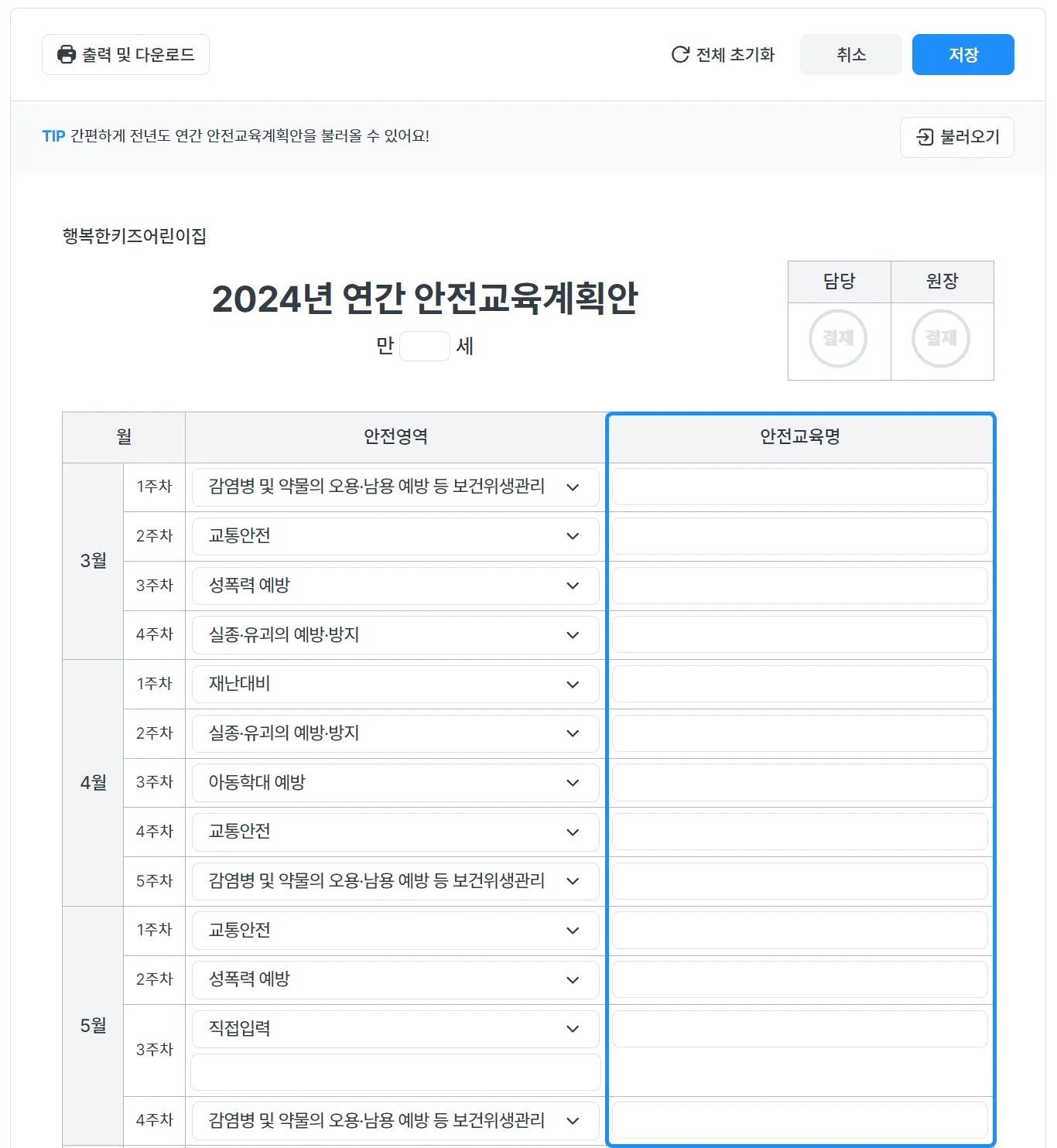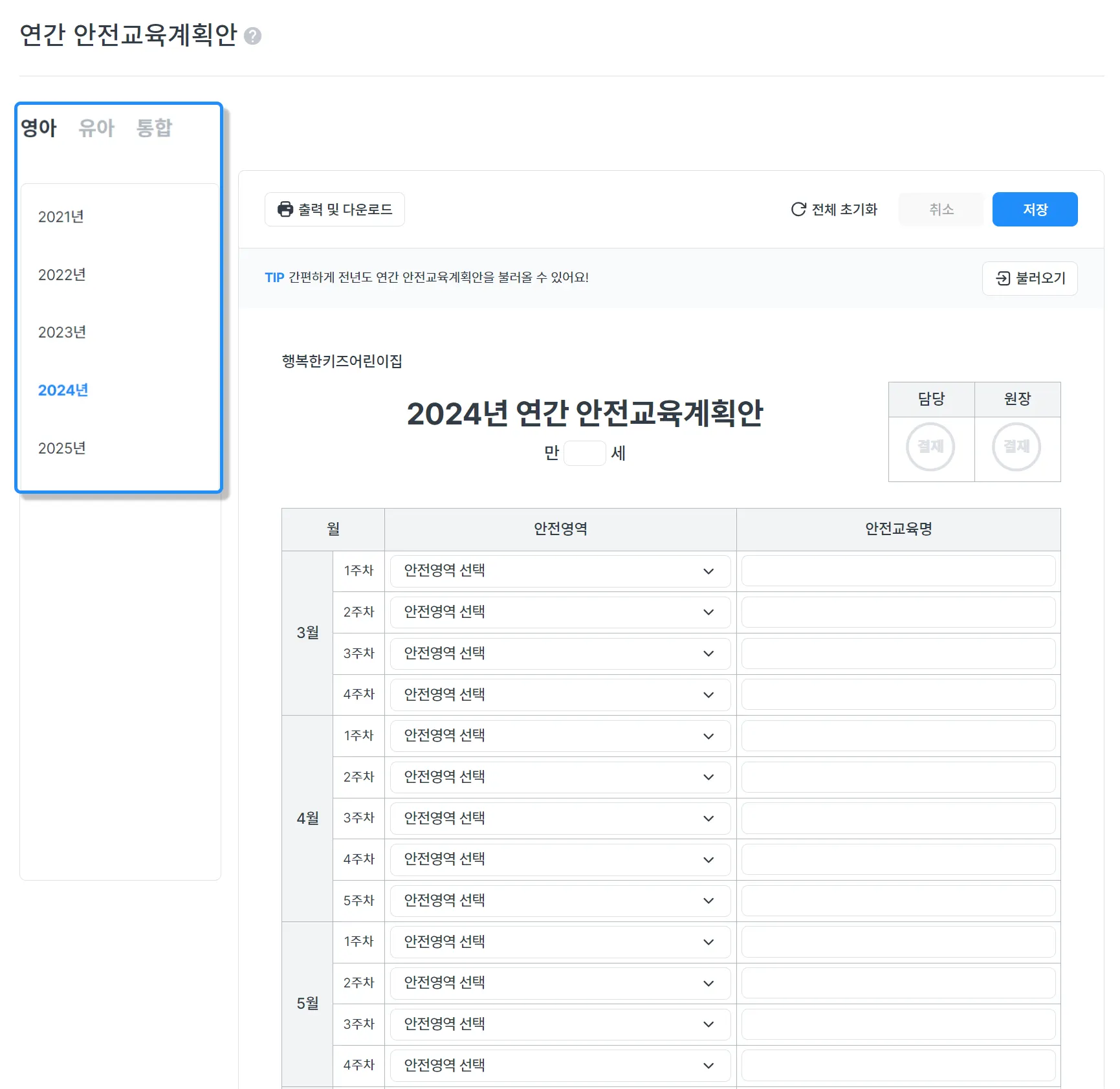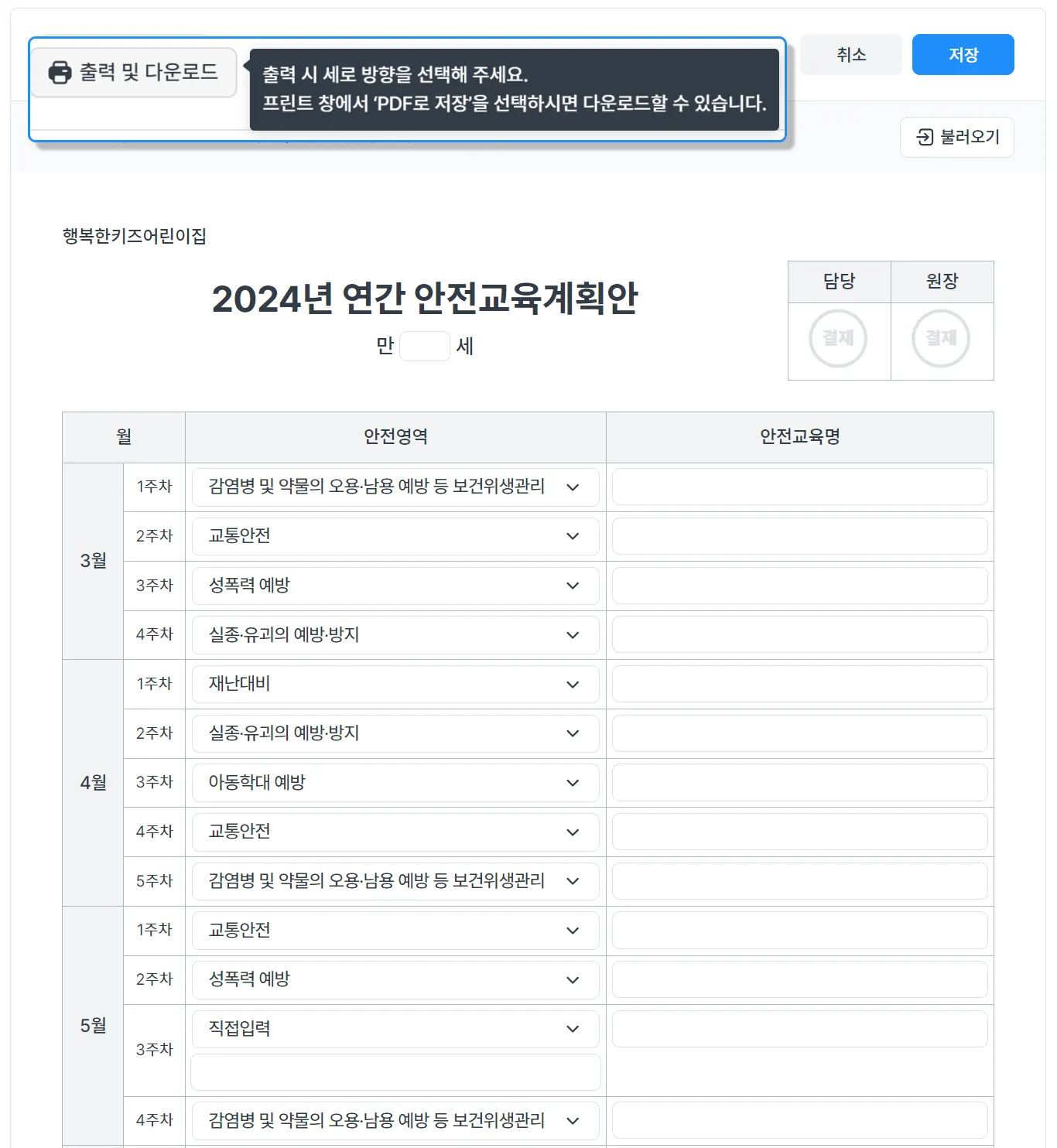 간편하게 전년도 연간 안전교육계획안을 불러와 작성할 수 있습니다.