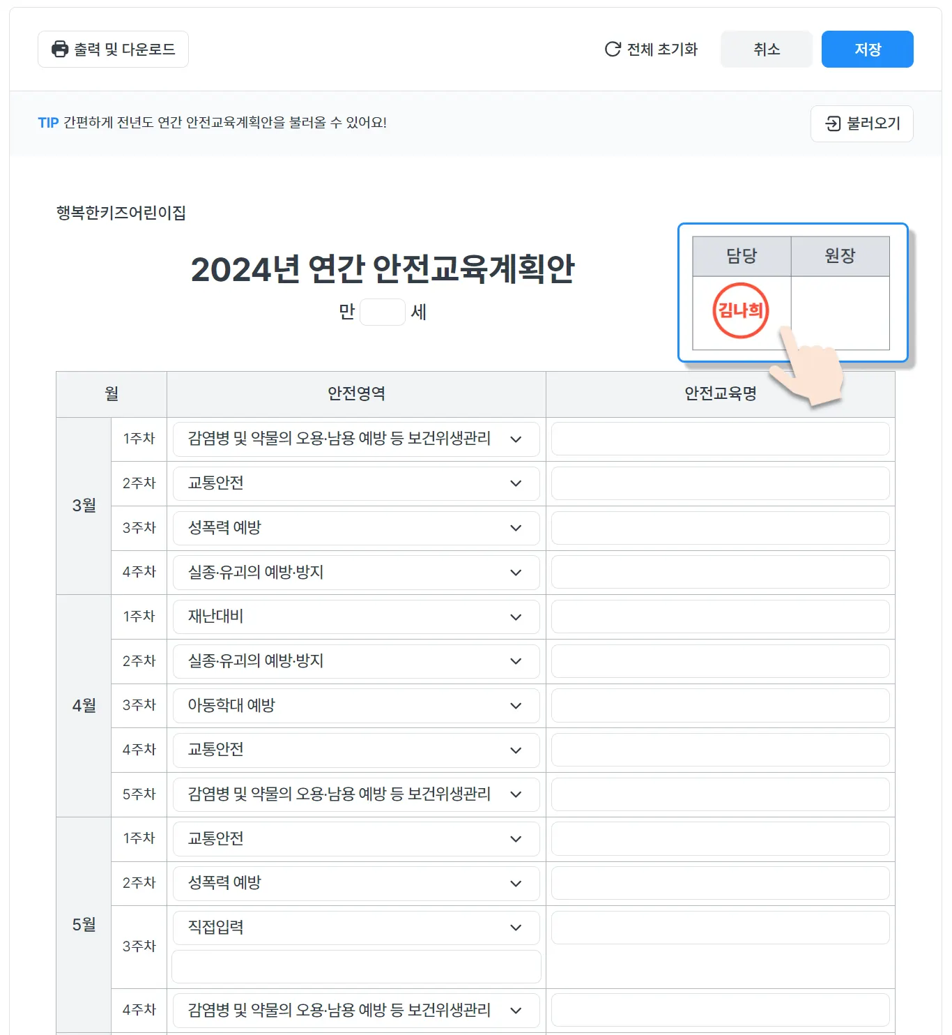 - 담당 영역 : 교사/원장 모두 서명 가능