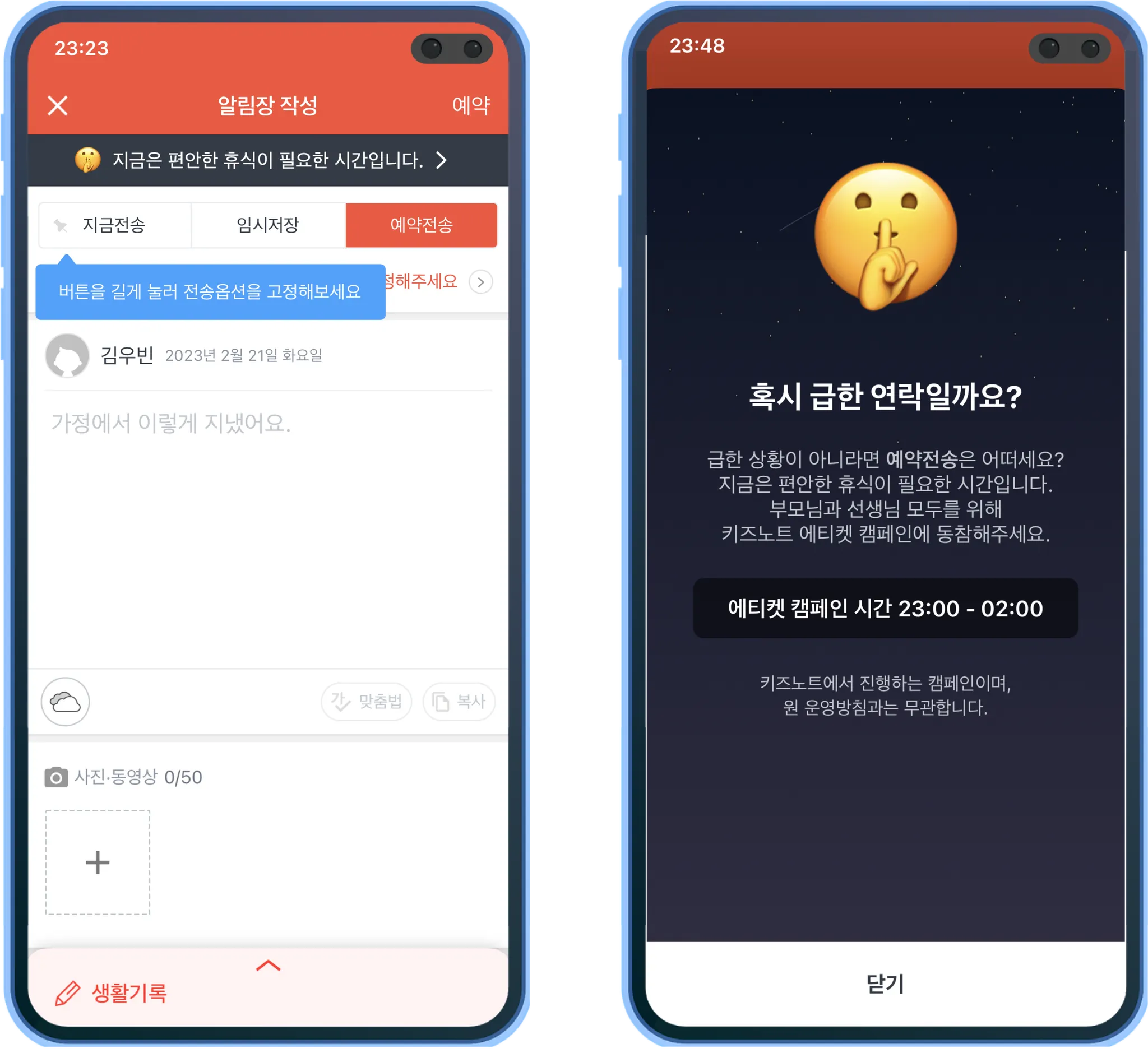 키즈노트에서는 23시부터 02시까지를 에티켓 캠페인 시간으로 지정하여, 해당 시간에 게시물을 발송하실 시 에티켓 캠페인 팝업이 안내되고 있어요.