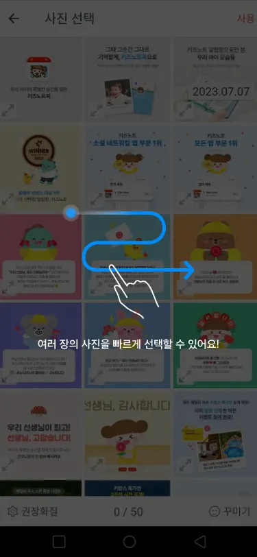 사진 첨부 화면에서 사진 한 장을 선택한 다음 화면에서 손가락을 떼지 않고 대각선 또는 직선 등 마지막 사진이 있는 곳까지 온 다음 손을 떼어주시면 사진들을 한 번에 선택하실 수 있습니다.