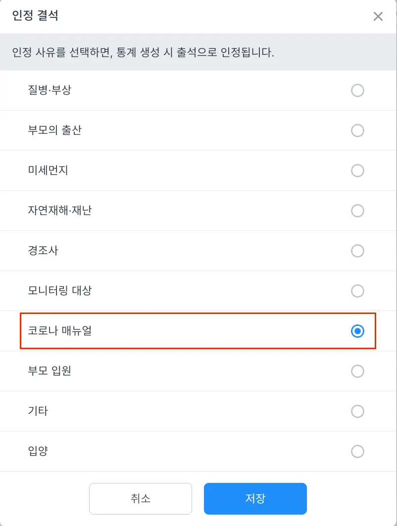 출석부에 ‘코로나 매뉴얼’ 인정 결석 사유가 추가되었어요!