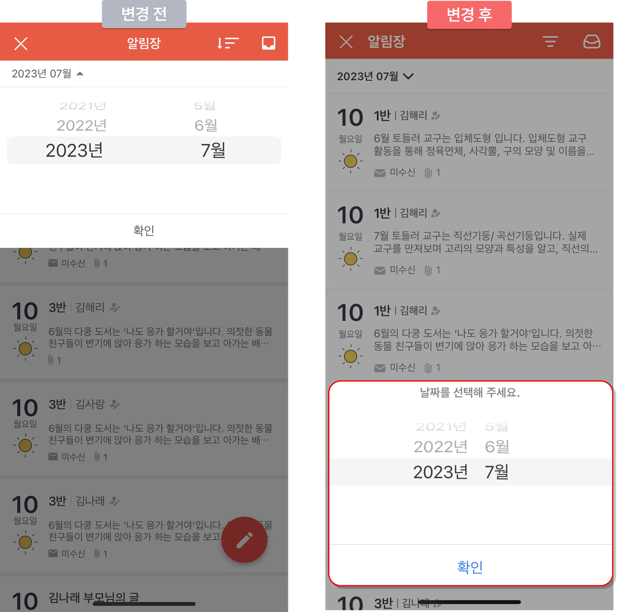 알림장 메뉴 날짜 필터 위치가 변경되었어요!