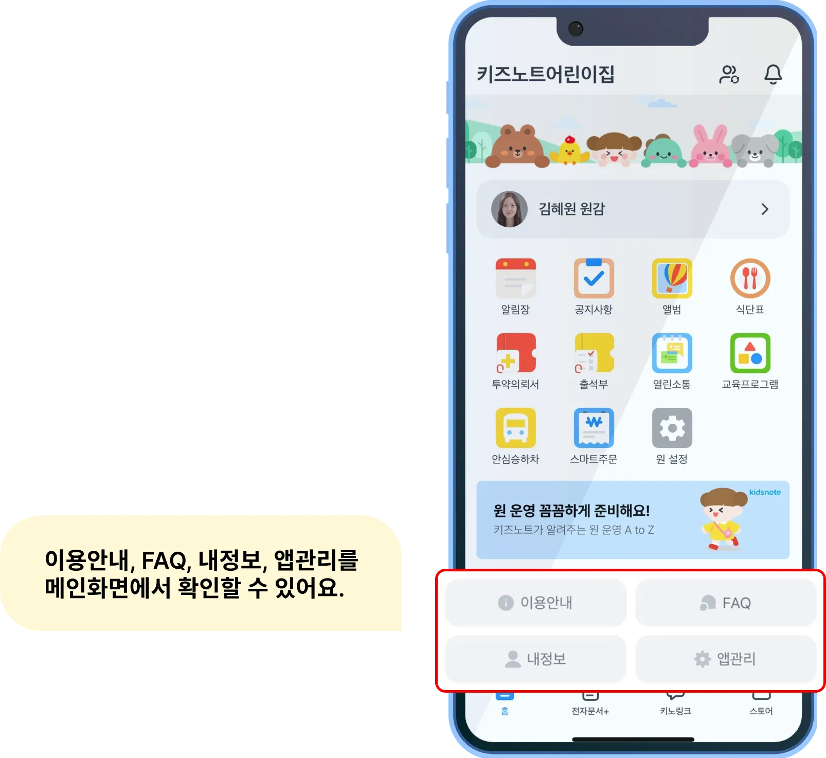 키즈노트 사용방법, 자주묻는질문 등 필요한 정보를 보다 빠르게 확인할 수 있어요.