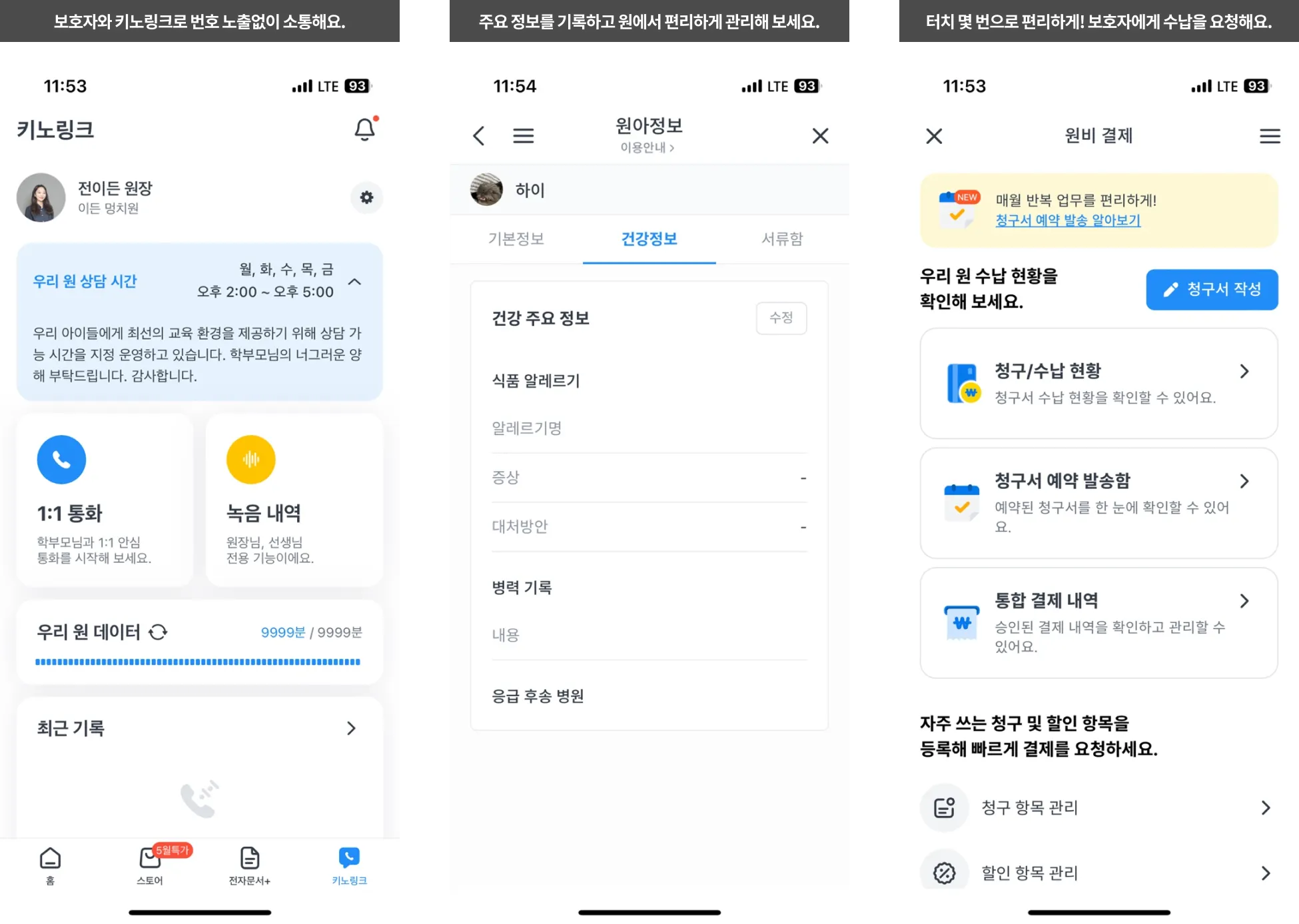 키노링크: 전화번호 노출 없이, 키즈노트 앱 하나로 통화까지 끝낼 수 있어요.
